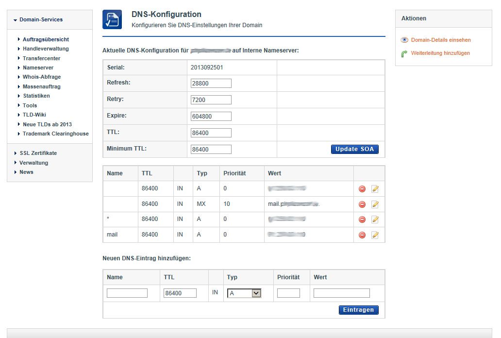 Unter der DNS Konfiguration können Sie beliebig viele Einträge pro Domain setzen. Egal ob CNAME, MX-Rekord, A-Einträge, AAAA-Einträge (IPv6), SRV oder TXT. Per Klick können Sie hier auch eine Weiterleitung einrichten.