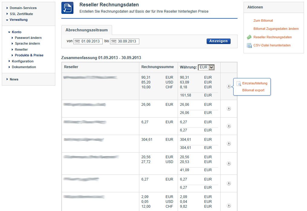 Per Klick haben Sie einen Überblick über Ihre Reseller und können gewählte Zeiträume bequem abrechnen. Mit der Einzelaufstellung sehen Sie sämtliche Details. Haben Sie einen Billomat Account, können Sie sogar zur automatischen Rechnungserstellung einen Export hier veranlassen.